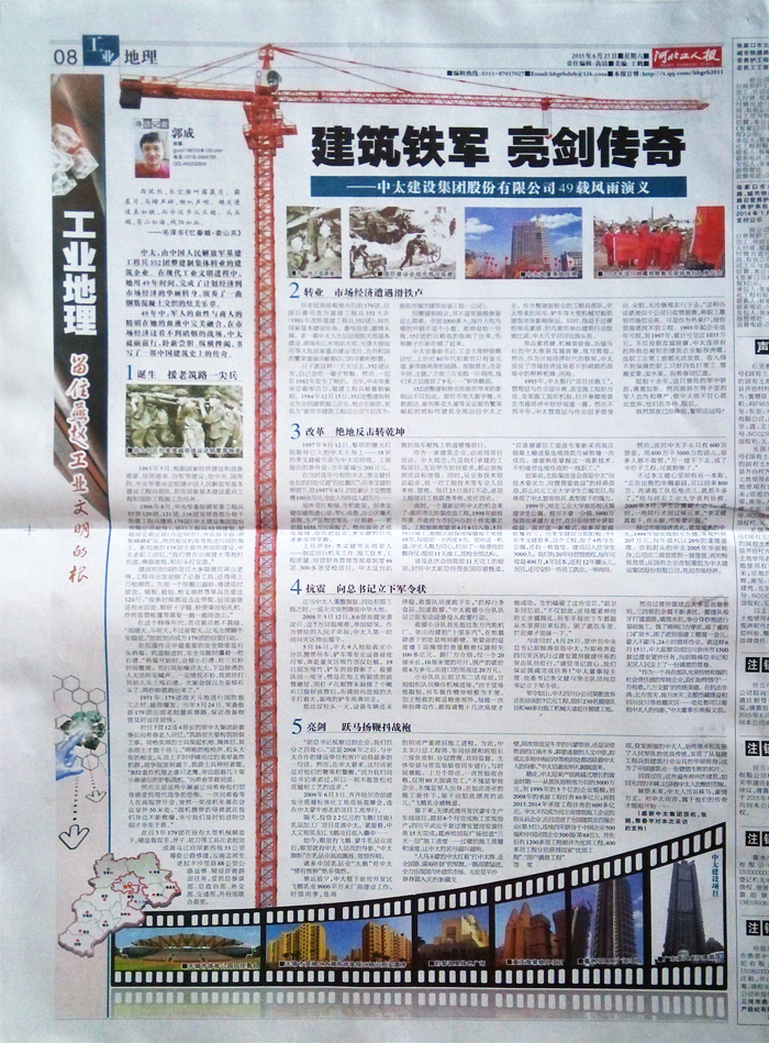 “人馬未歇的中太扛著‘打中太牌、走全國路、謀海外財’的軍旗,一路高歌猛進,全力征戰國內外建筑市場。無論是平沙莽莽黃入天的新疆戈壁,風吹草低見牛羊的內蒙草原,還是吳儂軟語的江南水鄉,群雄逐鹿的人文中原,抑或北非地中海沿岸等地到處都活躍著中太人的身影。”中太總裁張明禮娓娓道來。