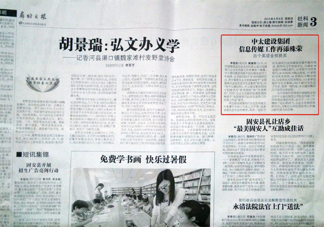 本網(wǎng)訊( 郭春宇)近日,由中國(guó)建筑業(yè)協(xié)會(huì)主辦第五屆全國(guó)建筑行業(yè)信息傳媒工作競(jìng)賽落下帷幕,中太建設(shè)集團(tuán)憑借不俗媒體宣傳工作成績(jī),在申報(bào)四個(gè)獎(jiǎng)項(xiàng)中脫穎而出。其中集團(tuán)企業(yè)文化部被授予“全國(guó)建筑行業(yè)信息宣傳先進(jìn)集體”稱號(hào),內(nèi)刊《中太建設(shè)報(bào)》、中太建設(shè)集團(tuán)網(wǎng)站分別被評(píng)為“優(yōu)秀報(bào)紙”和“優(yōu)秀網(wǎng)站”,同時(shí),企業(yè)文化部總經(jīng)理張娟娟被授予“全國(guó)建筑行業(yè)信息宣傳工作優(yōu)秀工作者”稱號(hào)。