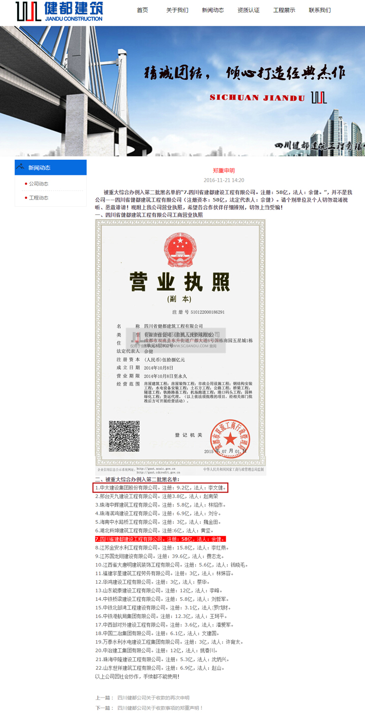 附:四川省健都建筑工程有限公司網站聲明截圖。