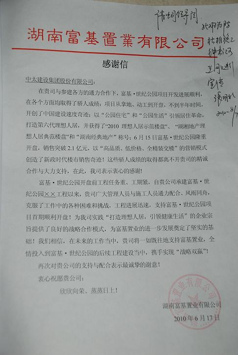 湖南富基置業公司來信感謝集團