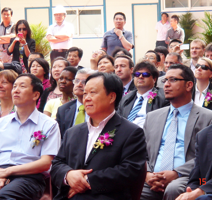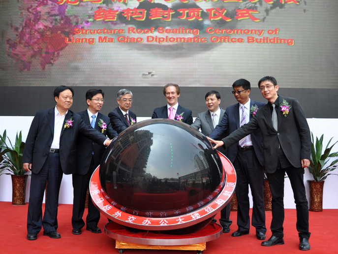 2013年5月15日上午,伴隨著最后一方混凝土的成功澆注,在50余名駐華外交使節以及外交部、北京市等有關部門代表的見證下,由集團公司第八工程局承建的亮馬橋外交辦公大樓工程正式實現主體結構封頂。董事局主席李文健(左一)應邀出席儀式。