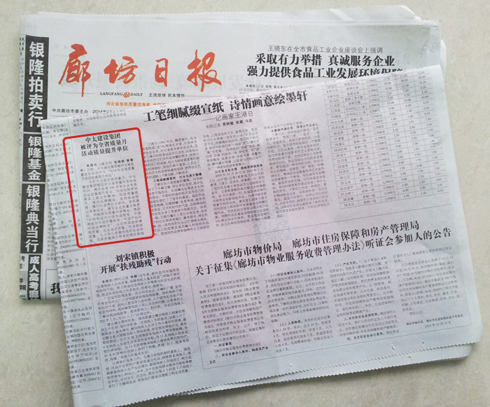 廊坊日報報道了中太建設集團被評為全省質量月活動質量提升單位